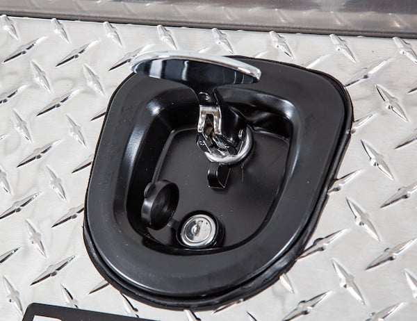 - The durable design incorporates a smooth aluminum body with a diamond tread aluminum door for great stability and looks. A die cast, locking T-latch and single rubber D-bulb door seal help keep your tools protected from weather and theft.