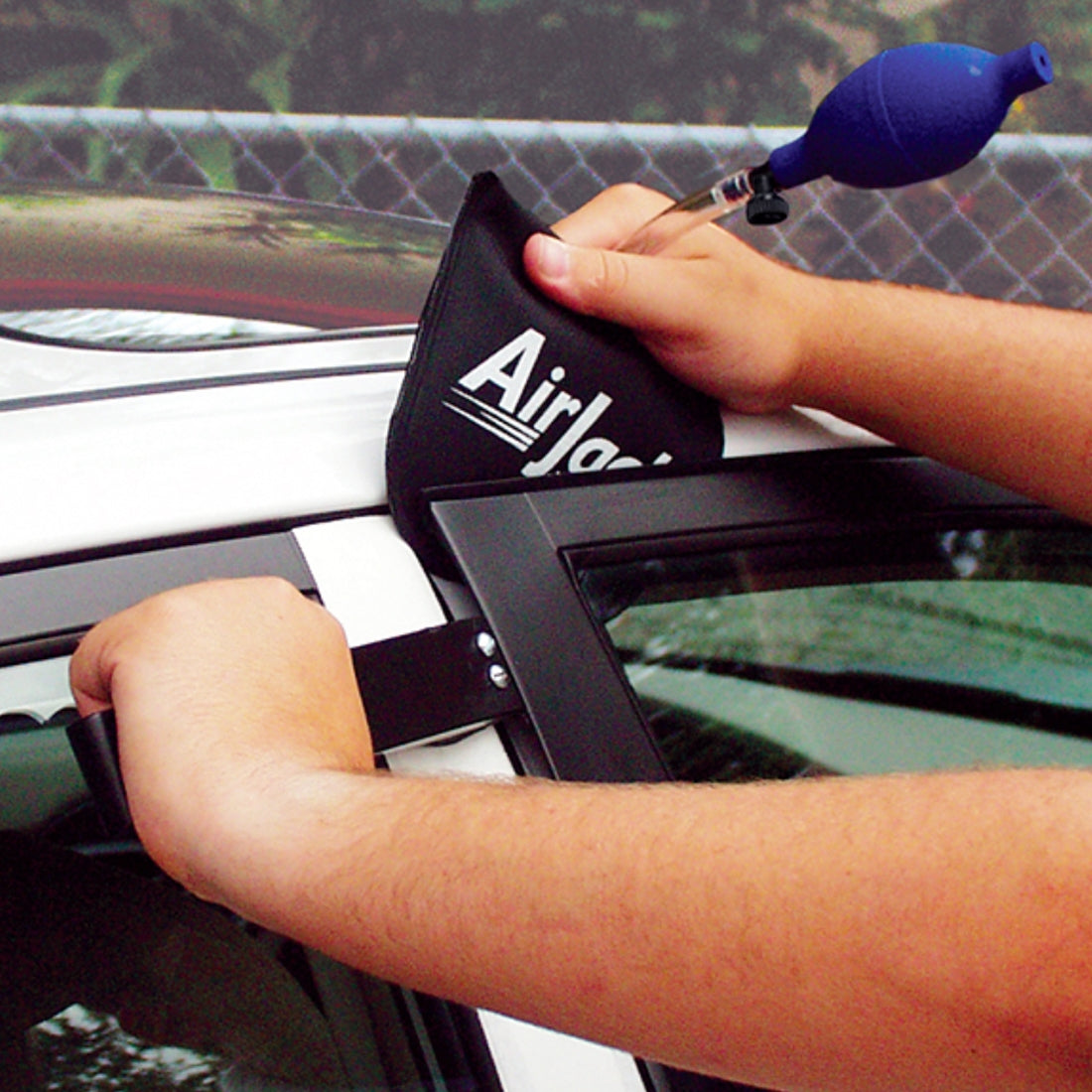 - Insert the jack tip between the door and frame