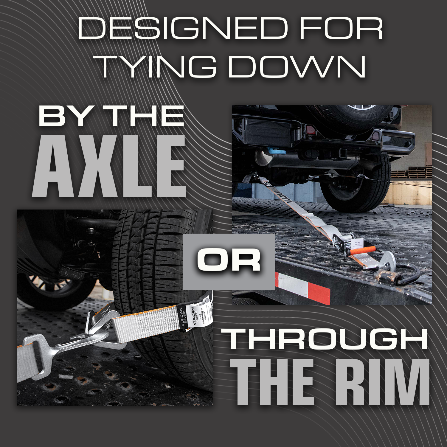 - Perfect for tying down by the axle or through the vehicle's rims