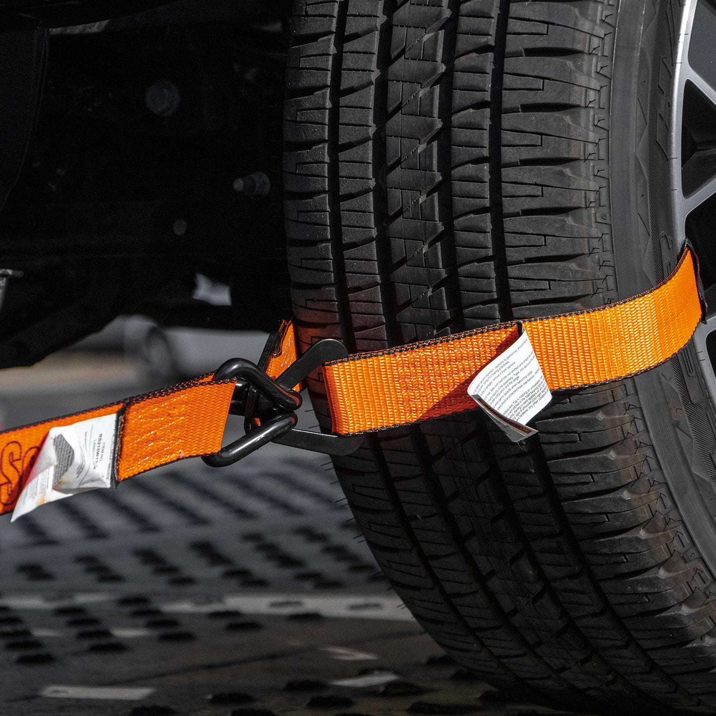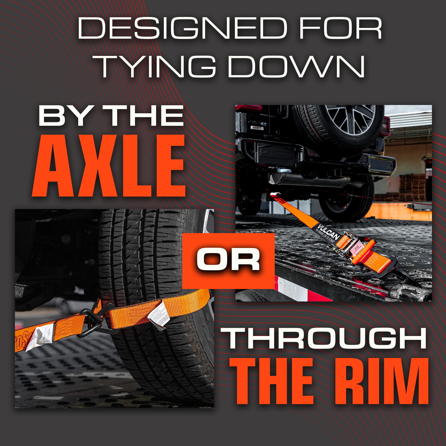 - PROFESSIONAL GRADE TIE DOWNS - Professional truck, trailer flatbed, and auto hauler operators choose Vulcan automobile tie down systems to haul millions of vehicles every year, and Vulcan is recognized as the most qualified, most experienced, car tie down manufacturer in the world. This 4-pack of 2'' x 36'' axle straps are gentle on your load and are designed to avoid scratching of delicate rims or damaging the underbody of the vehicle.