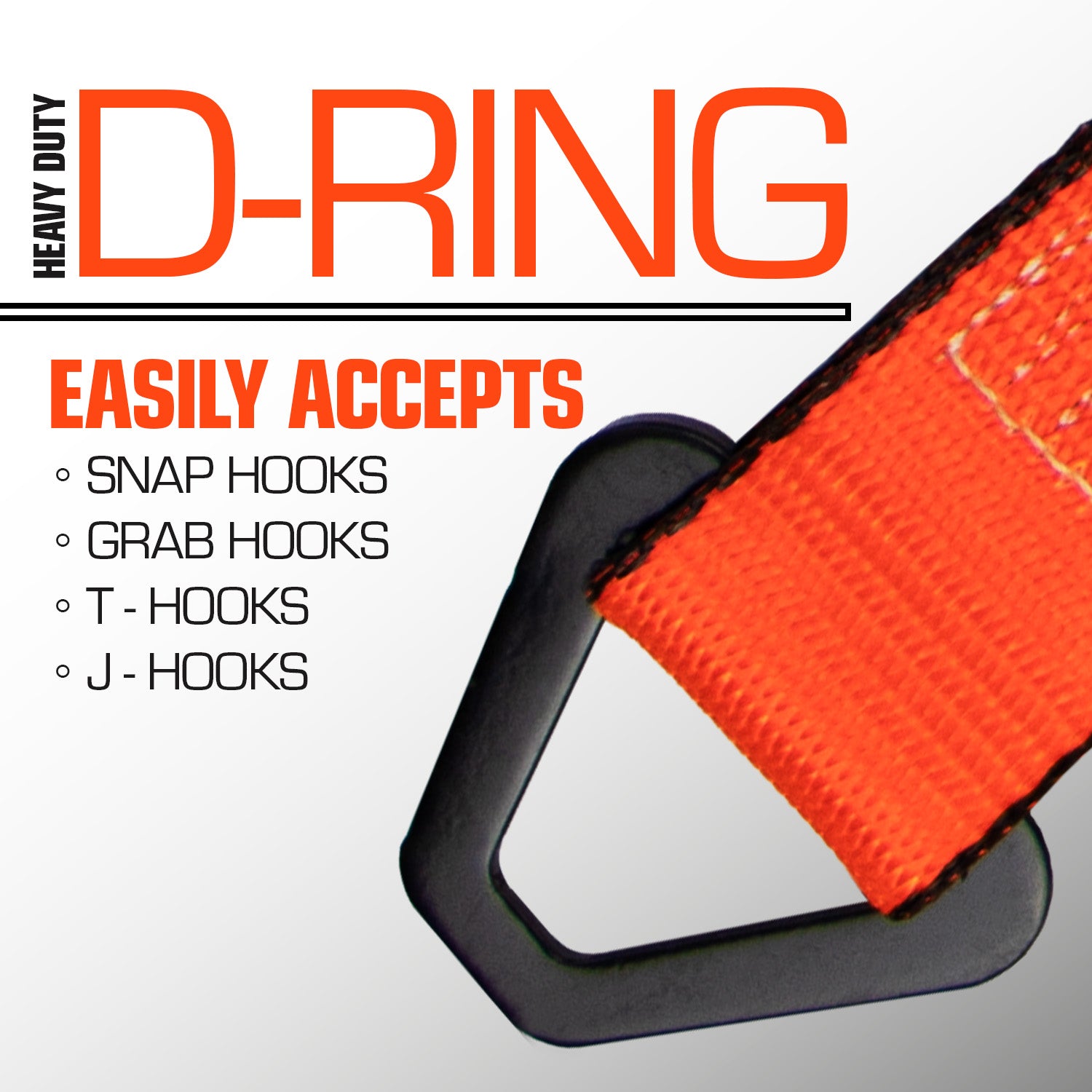 - EASY TO USE - The heavy duty D rings easily accept snap hooks, grab hooks, t-hooks or j-hooks, and you can even feed a chain through them. Just loop the strap around any axel or through a rim and bring the D rings back together. Attach any tensioning device and secure your load for transport. That's all there is to it!