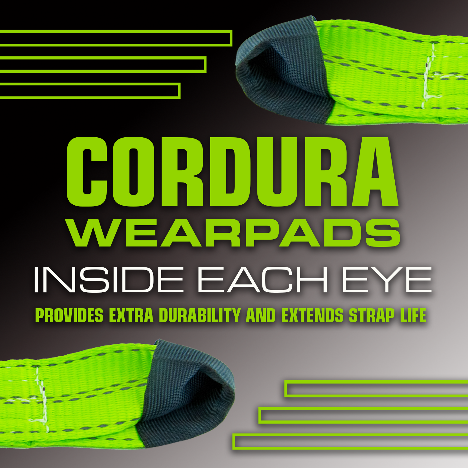 - HEAVY DUTY TIE DOWN WEBBING - Flexible 2 in. wide High-Viz tie down webbing provides excellent durability and long service life. Cordura wear pads are placed inside each eye for durability, and the soft, flexible design and soft eyes provide scratch free usage on valuable vehicles.