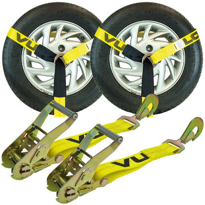 - INDUSTRIAL STRENGTH COMPONENTS - These heavy duty, car tie down units include smooth O-rings and a cordura wear pads. The certified polyester 2'' tie down webbing is coated for UV and cut resistance, and the smooth O-rings reduce strap wear, while the protective cordura wear pads also reduce strap and vehicle damage. The twisted snap hooks on the ratchets mate easily with side rails, D rings, and stake pockets.