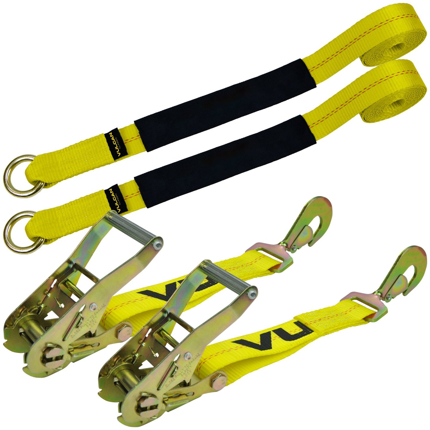 - SAFE AND COMPLIANT - Safe working load of 3,300 lbs. is stamped on the warning tag of tie down straps for easy inspection. All Vulcan vehicle transport products meet all CVSA and DOT specifications, and comply with NACM recommendations. You will be compliant for any roadside inspection, and you can work with confidence using Vulcan products - a name you can trust.
