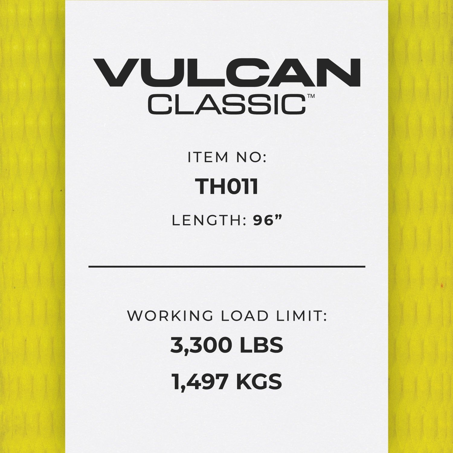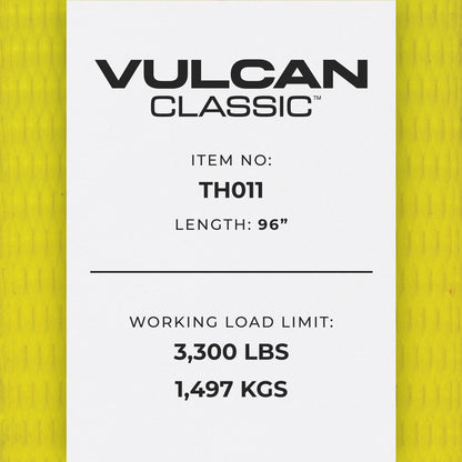 - YELLOW VULCAN WEBBING - Heavy duty Vulcan Classic Yellow 2 inch x 96 inch tie down webbing is cut and UV resistant, the strap features a plated O-ring and a cordura wear pad for maximum security and minimum rim damage.