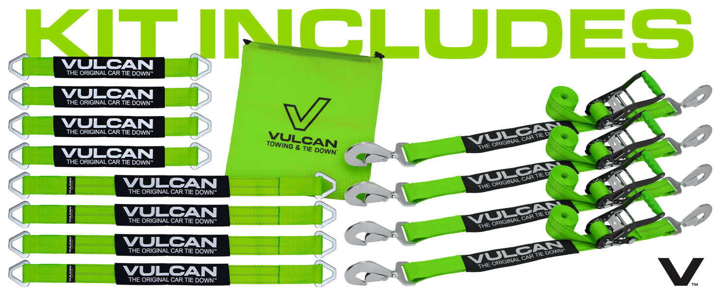 - PROFESSIONAL GRADE TIE DOWNS - Professional truck, auto hauler, flatbed, and trailer operators choose Vulcan auto tie down systems to haul millions of cars every year. Vulcan is recognized as the most qualified car tie down manufacturer in the world. This complete kit of axle straps and ratchet straps avoids scratching delicate rims or damaging the underbody of the vehicle. These straps are backed by 50 years of manufacturing expertise that only Vulcan can provide.