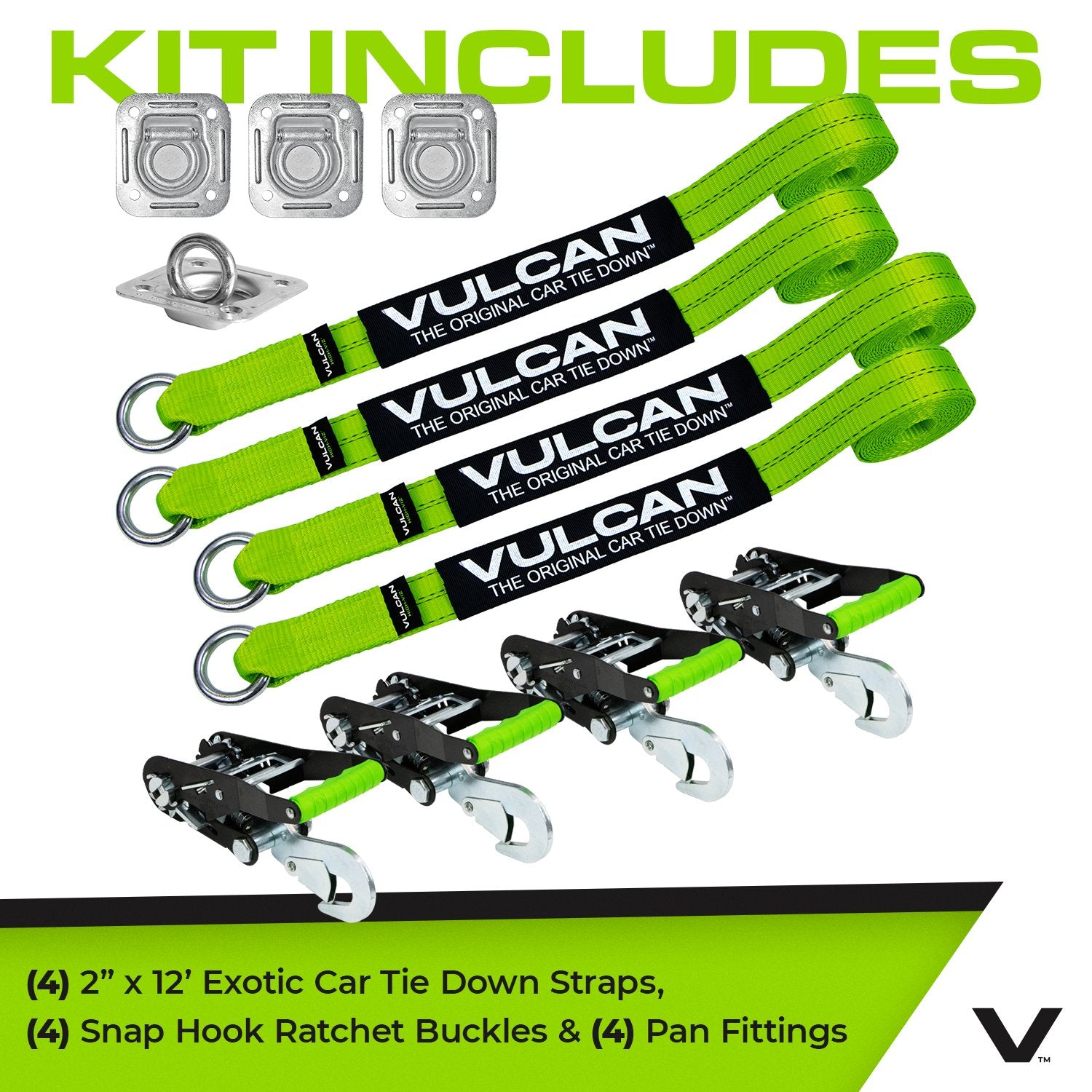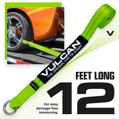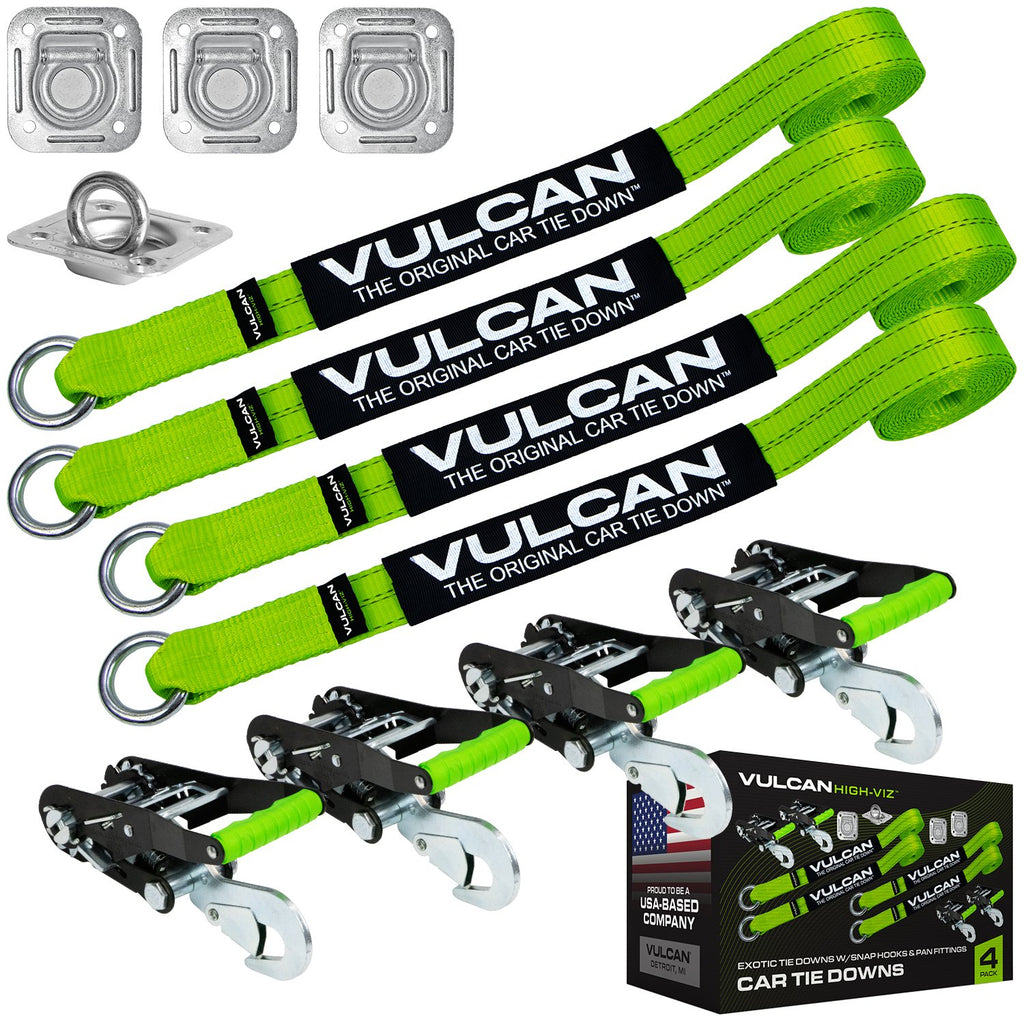 - PROFESSIONAL GRADE TIE DOWNS - Professional operators choose Vulcan automobile tie down systems to haul millions of vehicles every year. Vulcan is recognized as the most qualified, most experienced, vehicle tie down manufacturer in the world. Work with confidence, knowing that this complete kit of (4) 2" x 144" loop style rim straps, (4) snap hook ratchet buckles, and (4) 1/2" flush mount pan fittings is backed by the 50 years of manufacturing expertise that only Vulcan can provide.