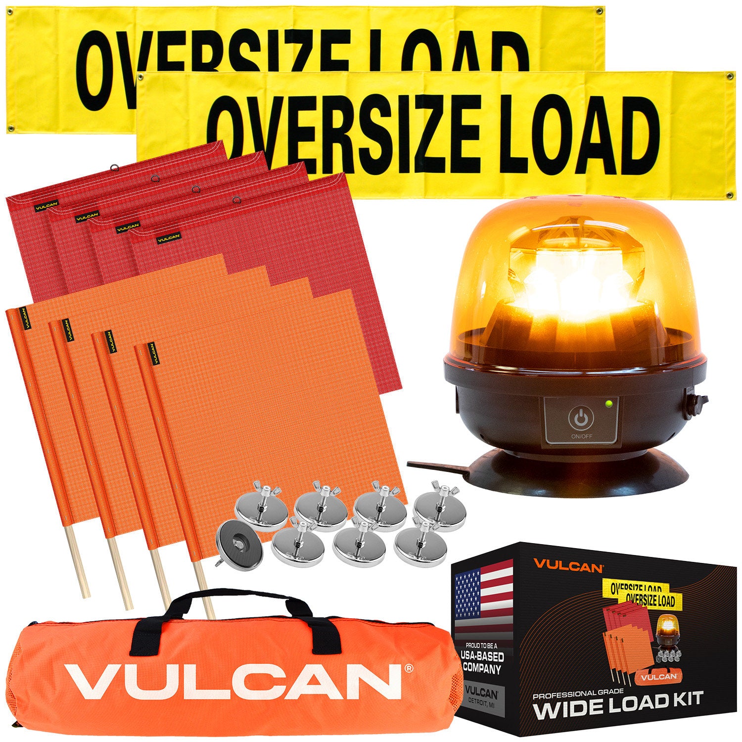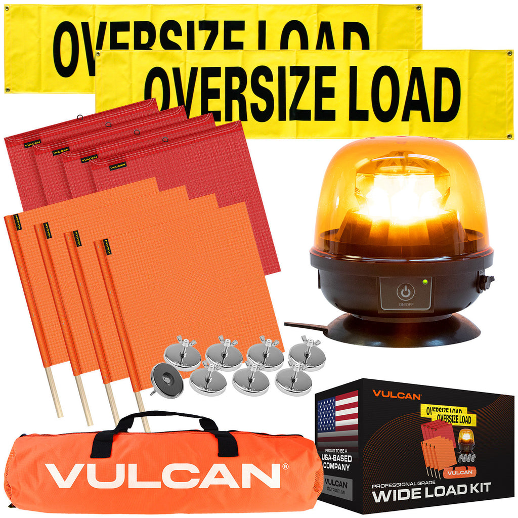 - SAFE AND COMPLIANT - The signs feature large black OVERSIZE LOAD letters are easily seen against the yellow background. Black edge binding increases contrast for extra visibility. Flags are made from high visibility vinyl coated polyester. Magnets accommodate the wire loop flags with a sturdy locking wing nut. All Vulcan wide load products meet all CVSA and DOT specifications. You will be compliant for any roadside inspection using Vulcan products - a name you can trust.