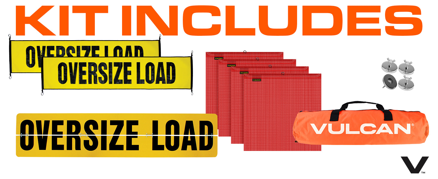 - COMPLETE OVERSIZE LOAD MARKING KIT - This professional oversize load package includes (1) 18 inch x 84 inch aluminum hinged OVERSIZE LOAD sign, (2) 18 inch x 84 inch mesh nylon OVERSIZE LOAD signs with heavy-duty bungee cords, (4) heavy-duty wing nut magnets, and (4) 18 inch x 18 inch bright red heavy-duty wire loop flags.