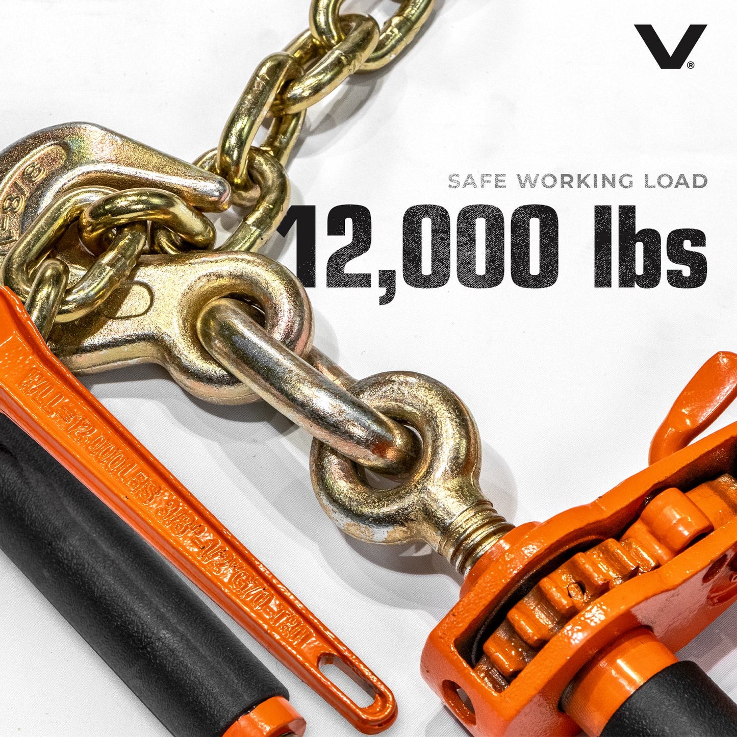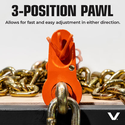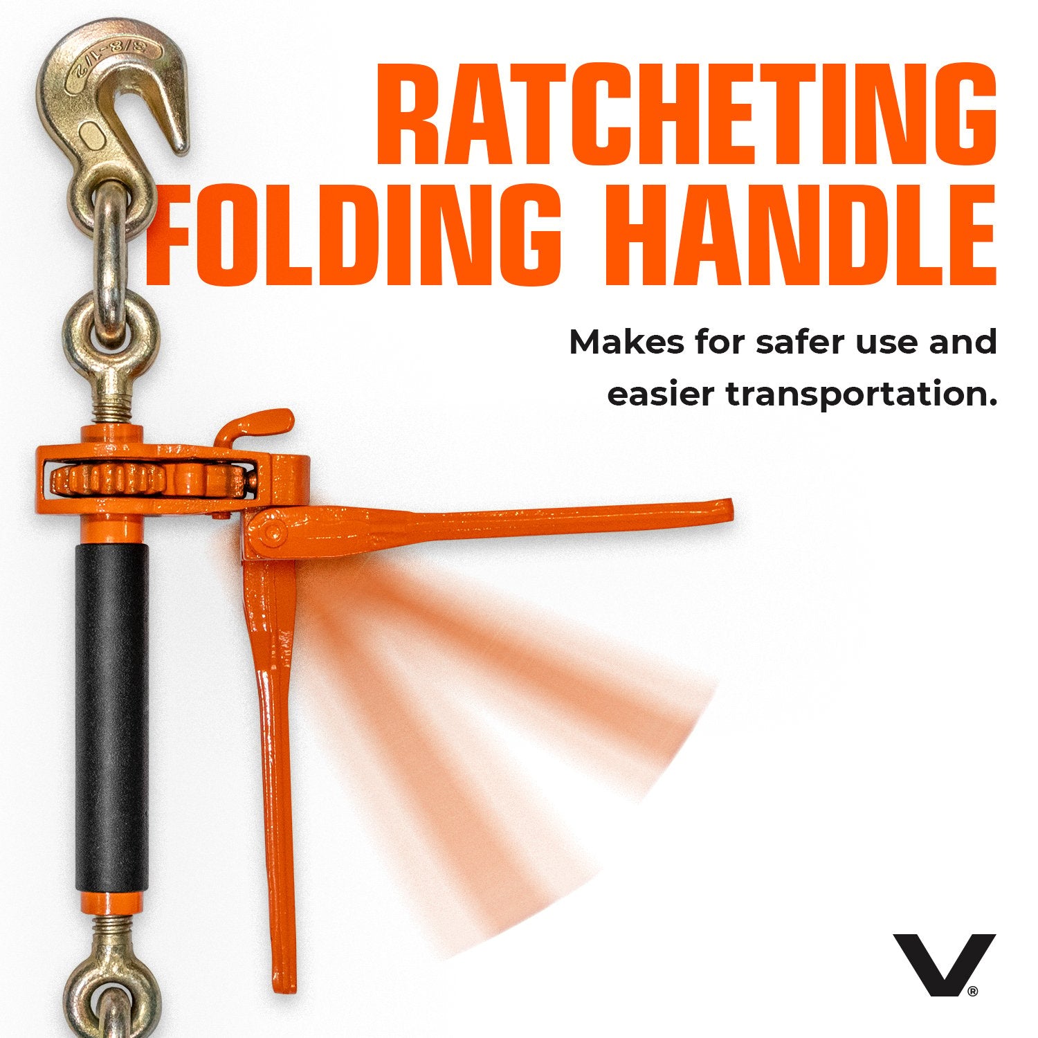 - Folding handle for safety and ease of use - The forged ratchet style handle folds down to eliminate the dangers of catching on a handle that sticks out while in use. When extended, the handle provides extra leverage so you can get the proper amount of tension on your chain tie-down every time. The forged steel pawl and gear system is easy to use and prevents "snap backs" and other dangers to users when loading and unloading.