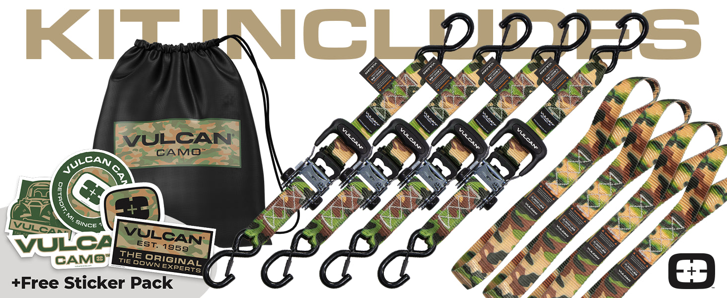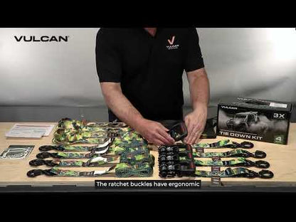 - 3X STRONGER THAN STANDARD 1 INCH STRAPS – Heavy duty 1.6” camouflage tie down webbing has a Safe Working Load of 1600 lbs. Standard 1” tie down straps only have a Safe Working Load of 500 lbs., making VULCAN 1.6” tie downs over three times stronger than standard straps that others offer. Each strap is constructed with three box stitch sew patterns for extra strength and long service life. Many other straps only have one or two patterns because of their low working load requirements.