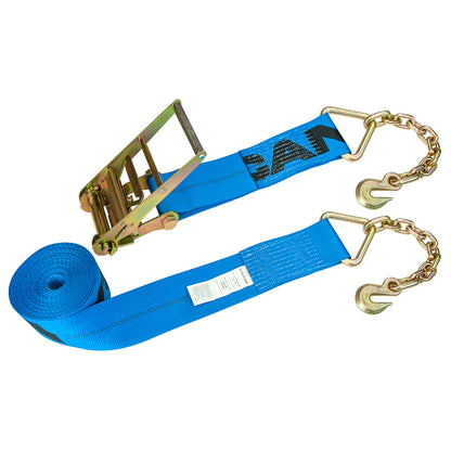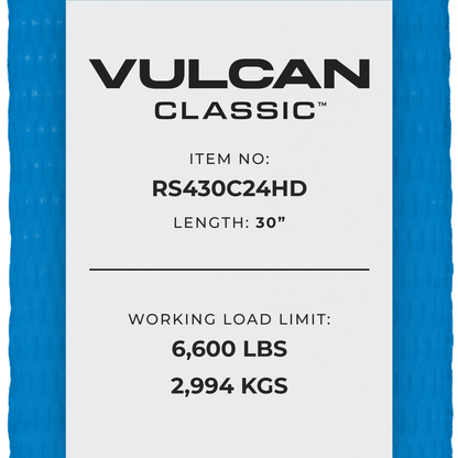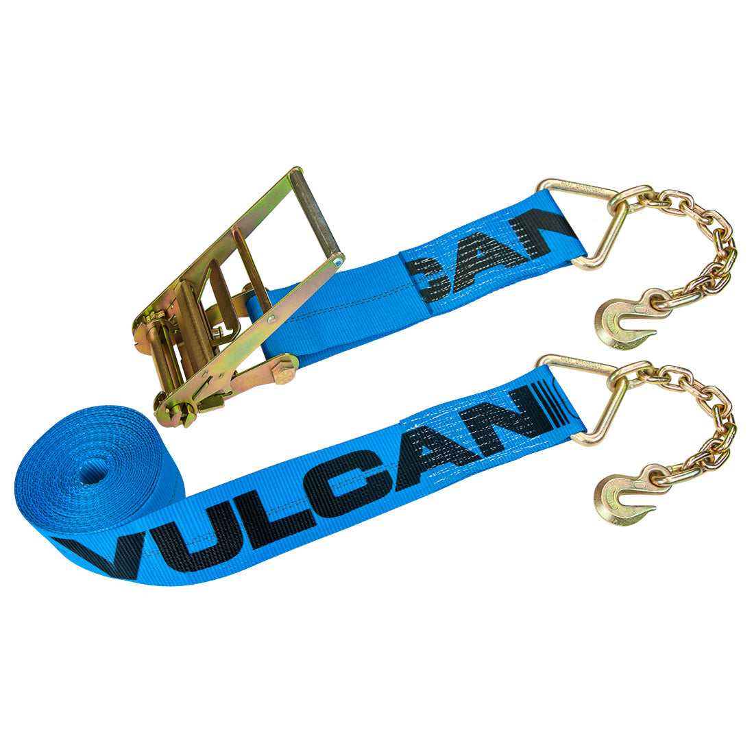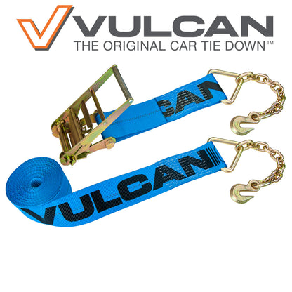- SAFE AND COMPLIANT - This ratchet strap is made with 24,000 lbs. webbing and 3/8 inch Grade 70 chain anchors for a full 6,600 lbs. safe working load, higher than standard 4 inch ratchet straps with chain anchors. All Vulcan cargo control products meet all CVSA and DOT specifications, and comply with NACM recommendations. You will be compliant for any roadside inspection, and you can work with confidence using Vulcan products - a name you can trust.