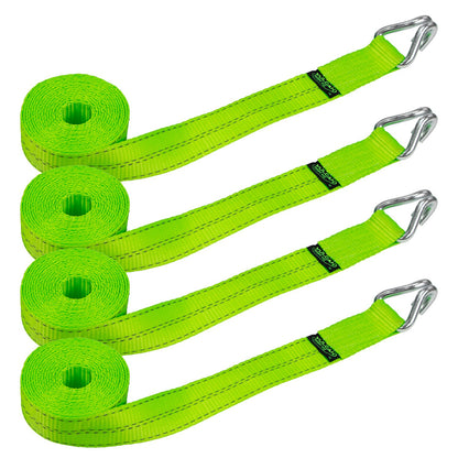 - UNIQUE HIGH-VIZ WEBBING - Flexible 2 inch wide ultra-bright neon green straps are extremely visible in daytime light conditions, and the special retro-reflective fibers shine brightly at night for extra visibility in low light conditions. This extra thick tie down webbing is thick and strong for excellent durability and long service life.
