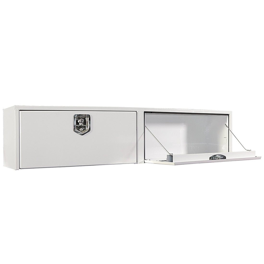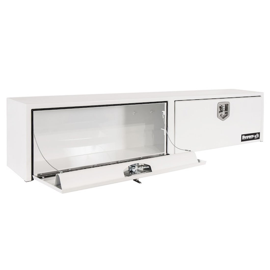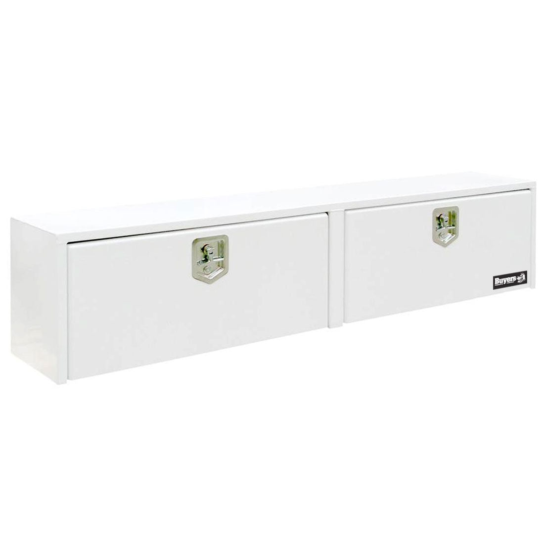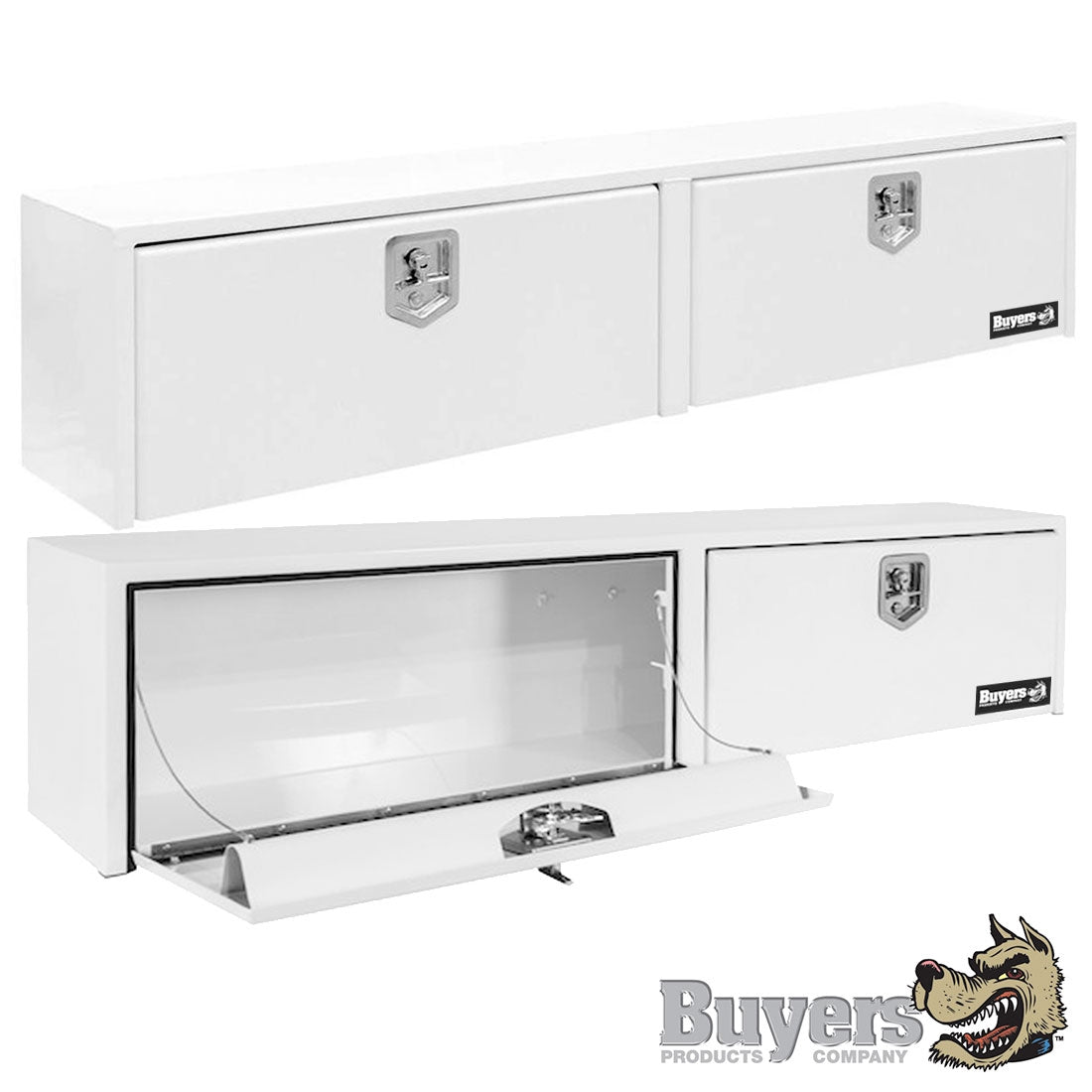 Buyers steel underbody toolboxes are constructed of 14-gauge high quality American steel. The 12-gauge steel doors feature crossbar reinforcement to shield the locking mechanisms from bumps without limiting storage capacity. The flush mounted doors have a pitched top lip design to avoid water collection, and the 1/2" automotive style door gasket forms a continuous seal to keep the elements out. T-handled latches are easy to grip and the powder coat finish provides superior corrosion resistance.