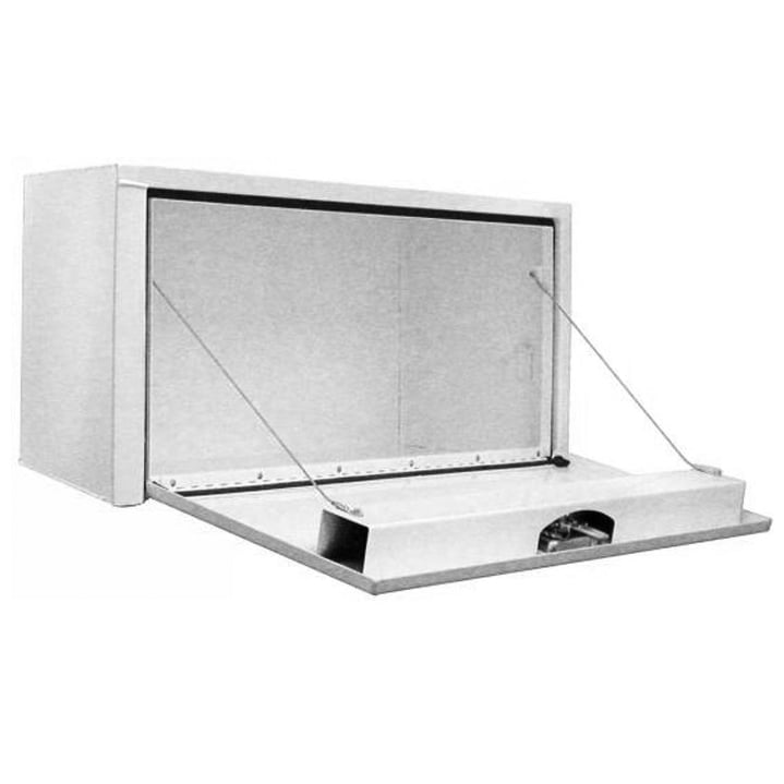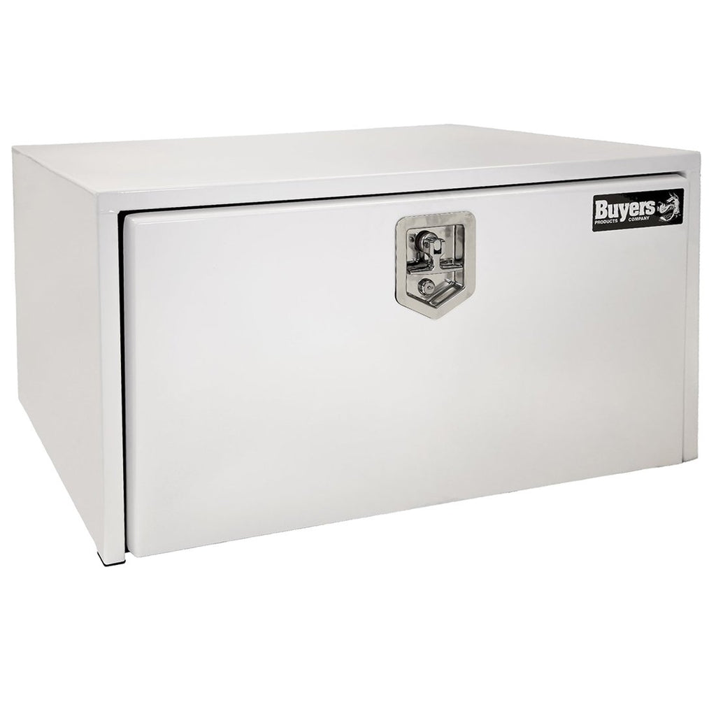 Buyers steel underbody toolboxes are constructed of 14-gauge high quality American steel. The 12-gauge steel door features crossbar reinforcement to shield the locking mechanism from bumps without limiting storage capacity. The flush mounted door has a pitched top lip design to avoid water collection, and the 1/2" automotive style door gasket forms a continuous seal to keep the elements out. T-handled latches are easy to grip and the powder coat finish provides superior corrosion resistance.
